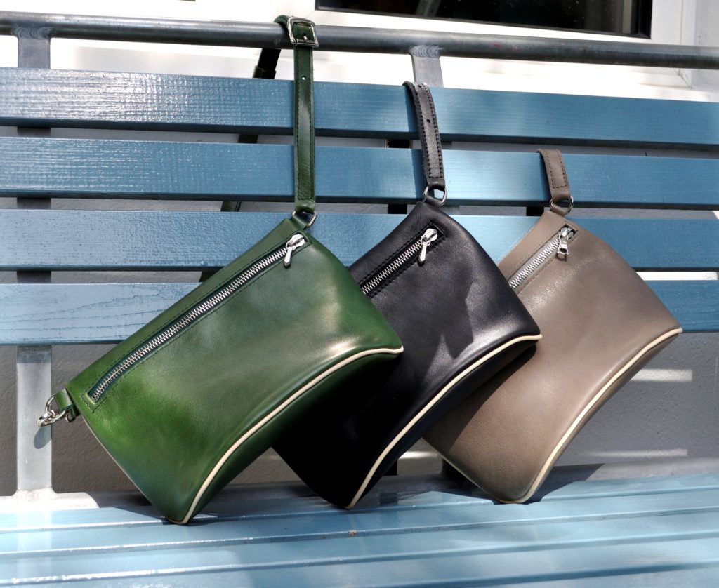 Aata ist Clutch, Umhängetasche oder Bauchtasche. Der herausnehmbare Riemen kann auch als Gurt verwendet werden. Sie hat ein flaches Innenfach, ideal fürs Handy oder einsame Kreditkärtchen. Aus eher dickerem Leder gefertigt.